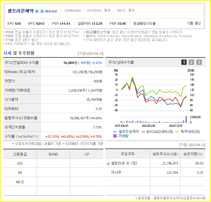 셀트리온제약의 현재 주가는 전일 대비 -400원 하락한 94,800원이다. 셀트리온제약의 주주현황을 보면 셀트리온(외 13개사)이 55.03%의 지분을 보유하고 있다. 셀트리온제약은 장중 주가가 9만4800원인 제약회사다. 셀트리온제약의 시가총액은 3조 5,107억원이며 발행주식수는 7.73주이다.