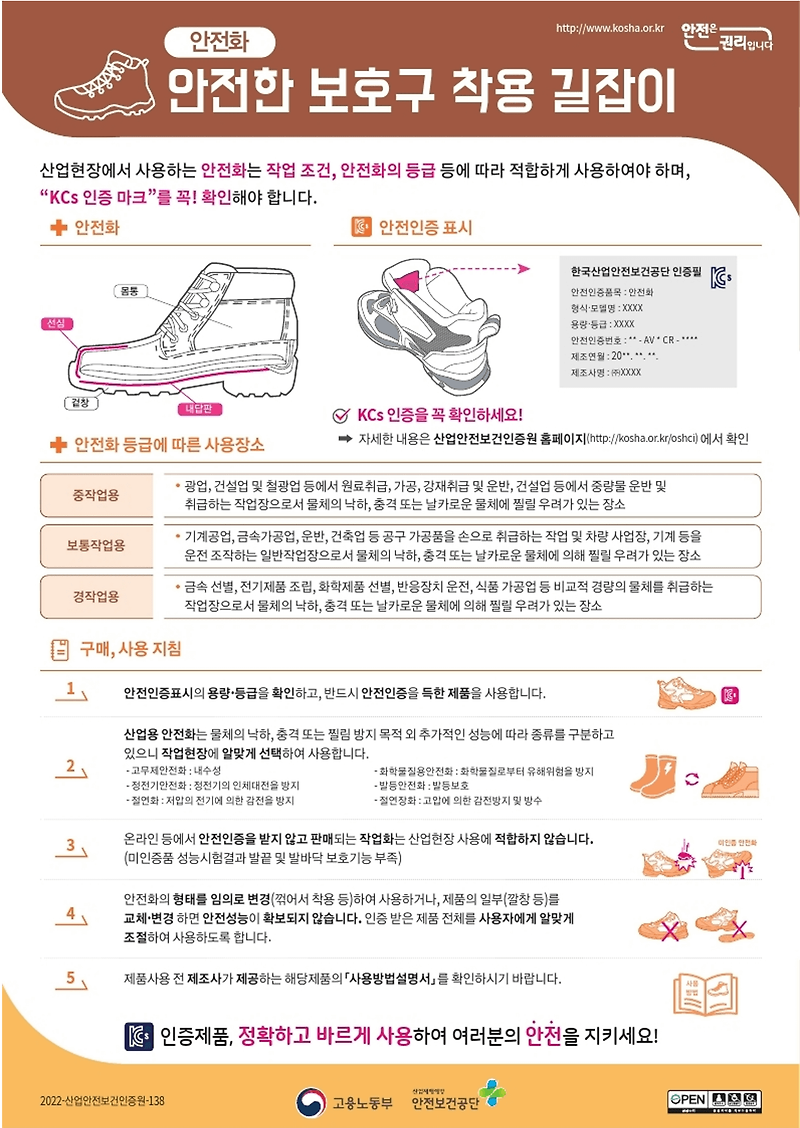 아래에 해당하는 경우 KCs 인증을 받아 판매해야 합니다. 물체의 낙하·충격 또는 날카로운 물체로 인한 위험으로부터 발 또는 발등을 보호하거나 물·기름·화학물질 등으로부터 발을 보호하기 위하여 사용하는 안전화 전기에 의한 감전 또는 정전기의 인체 대전을 방지하기 위하여 사용하는 안전화 안전화 정의