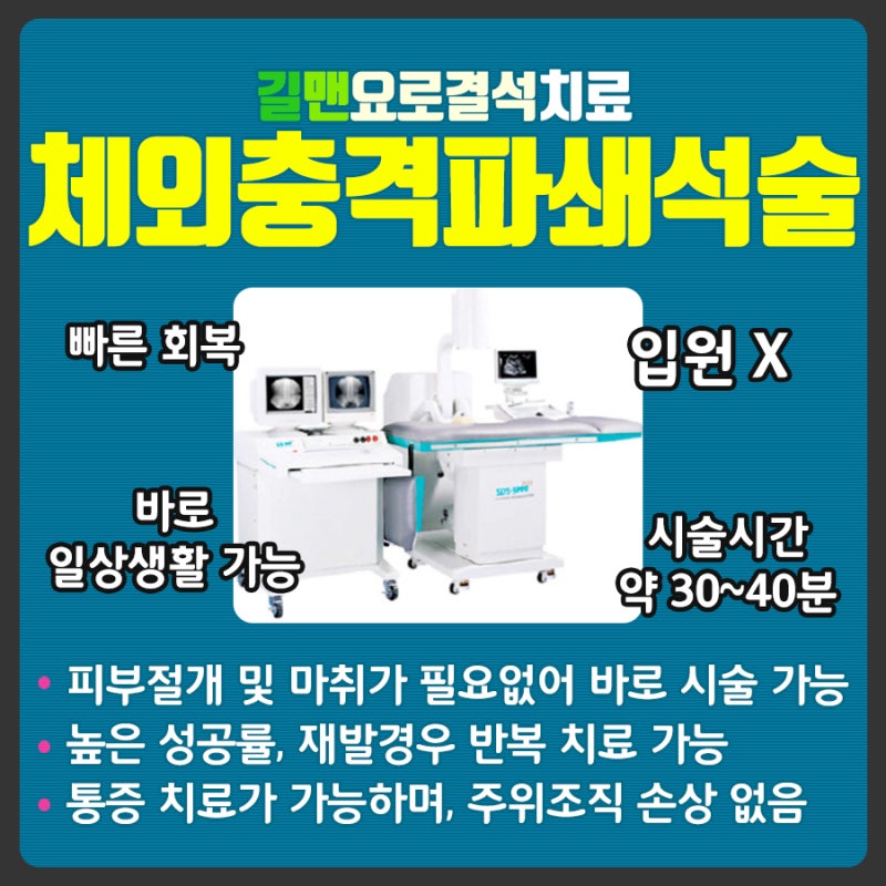 대전길만비뇨기과에서 입원이 필요없는 체외충격파쇄석술에 대해 알아보았습니다. 무엇보다 길만한의원에서 진료를 받을 경우 대학병원에 비해 의료보험 적용으로 약 50%의 비용을 절약할 수 있다는 점도 장점이니 부담갖지 마시고 상담을 받아보시길 바랍니다.