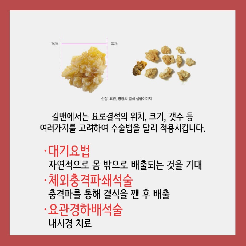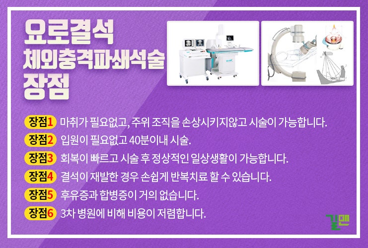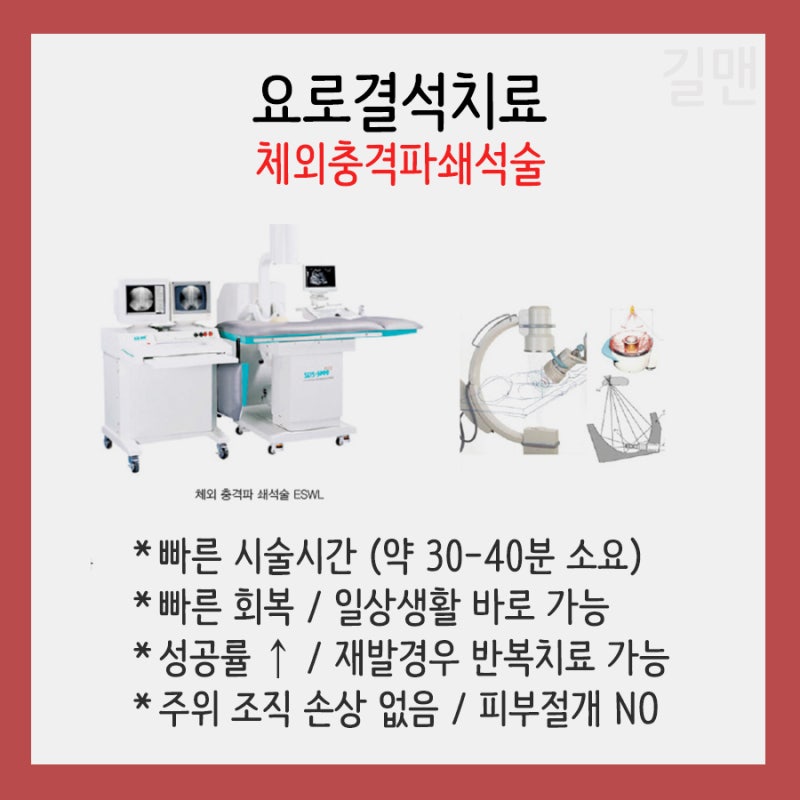 통증이 심하거나 진통제를 복용해도 일상생활이 어려운 경우에는 병원에 가셔서 몸 상태를 확인하셔야 합니다. 대전길만비뇨기과의 체외충격파쇄석술은 요로결석의 크기가 4mm 정도일 때 치료하는 방법이다. 마취나 절개 없이 90% 이상의 성공률을 자랑하는 체외충격파쇄석술이라고 할 수 있습니다!