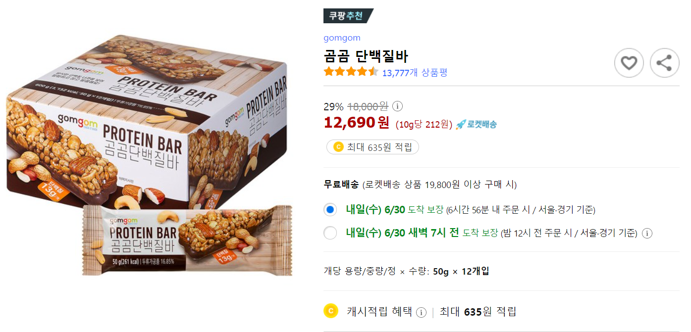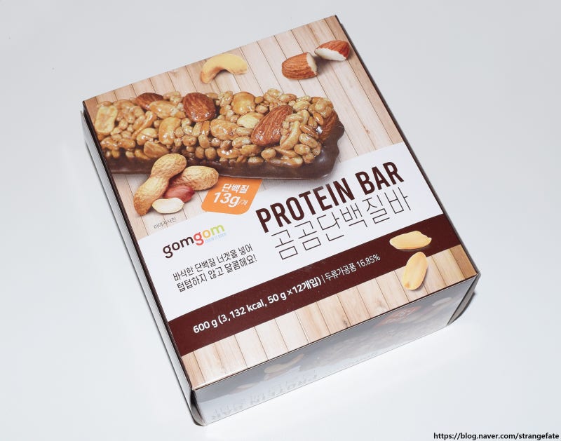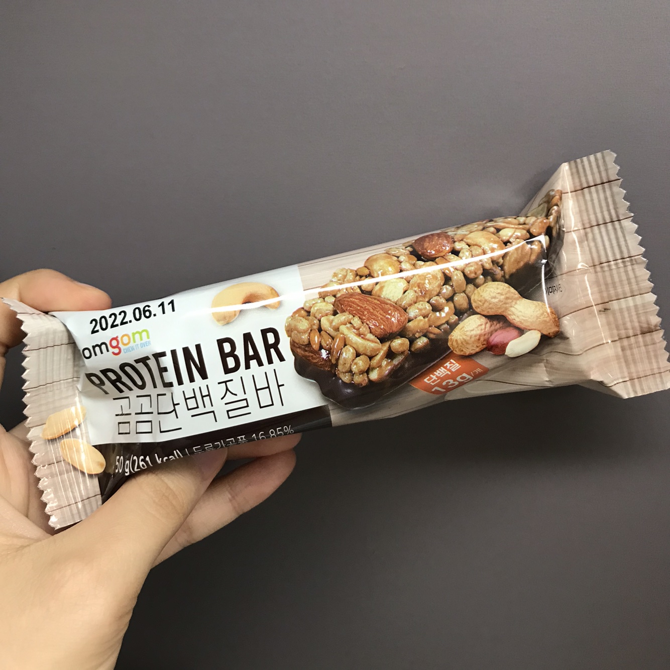 쿠팡 곰곰 프로틴바 미니 영양정보 총 480g, 48개, 10g 54kcal/bar 고단백(6개당 12g), 땅콩(37%), 아몬드(9%), 귀리(4%), 견과류 46% 유효기간은 1년이 아니라 1년 정도인 것 같습니다. . . 일주일 안에 먹을 수 있을 것 같아요.