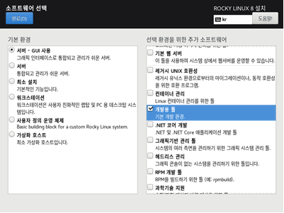 서버 유형 및 필수 패키지 선택. 필요할 경우 나중에 설치할 수 있으므로 개발 도구를 선택하고 계속 진행하십시오.