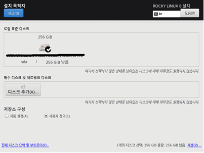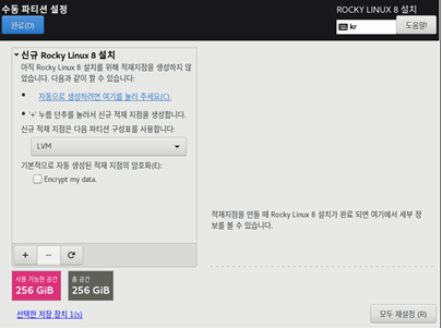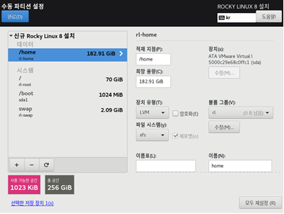 자동으로 설정하면 256G적당히 나누어져 있지만, /집나머지를 최소화하고 세분화 SDD그리고 하드 디스크붓다 /집 아래에 마운트하여 사용할 예정이므로 커스텀 구성으로 구성해 보겠습니다..
